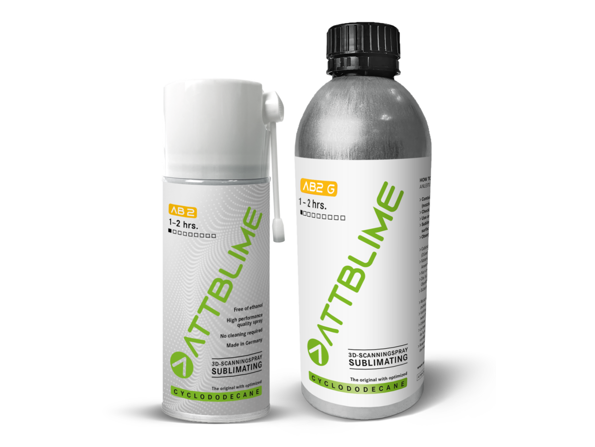 ATTBLIME AB2 3D szkenner spray  –  optikai 3D szkenneléshez tervezett finom permet, amely segít a tükröződő, fényes vagy sima felületek „mattá tételében”. Így a szkenner jobban felismeri a kontúrokat és részleteket, minimalizálva a visszaverődéseket és hibákat a pontfelhőben.
