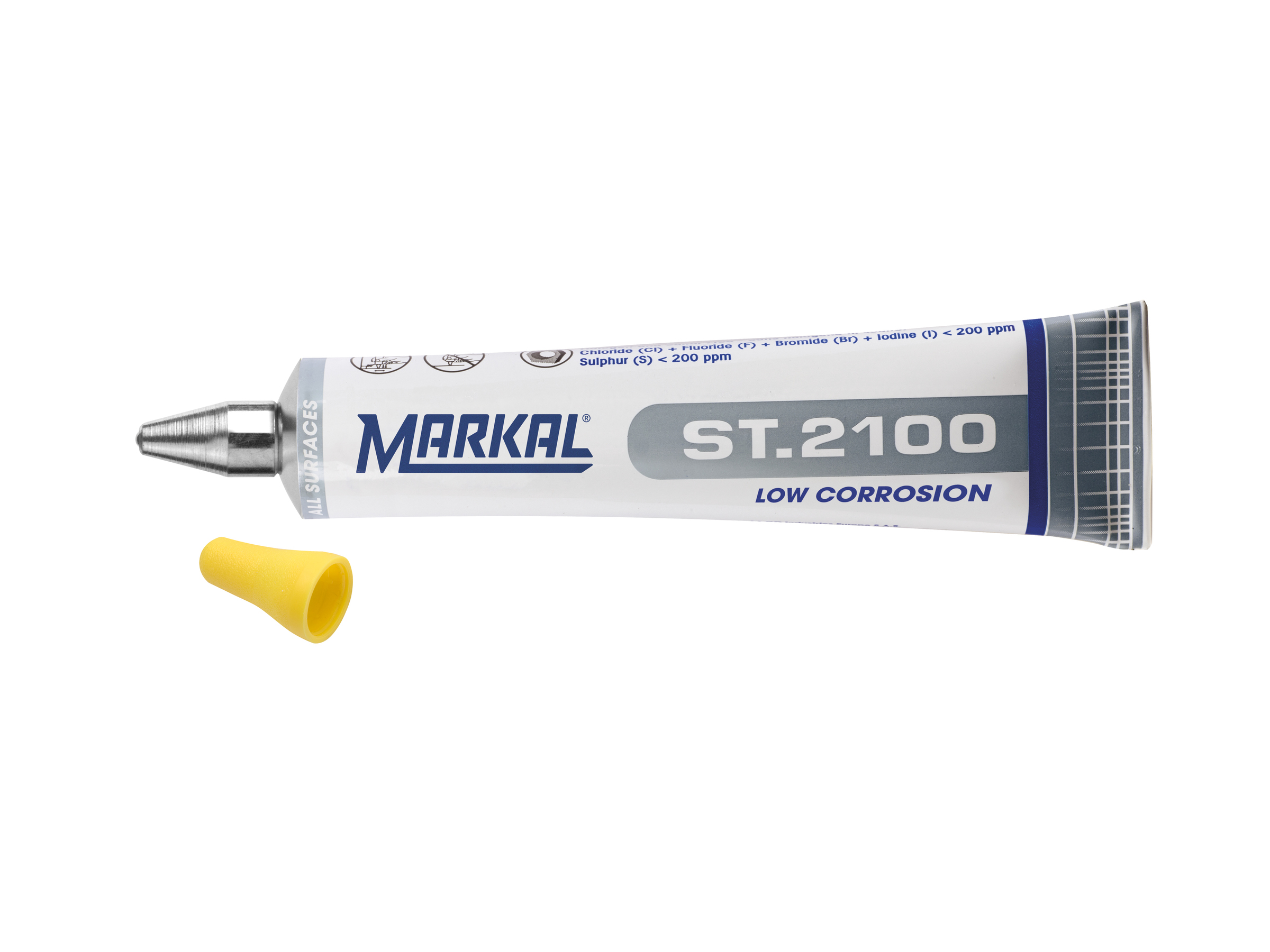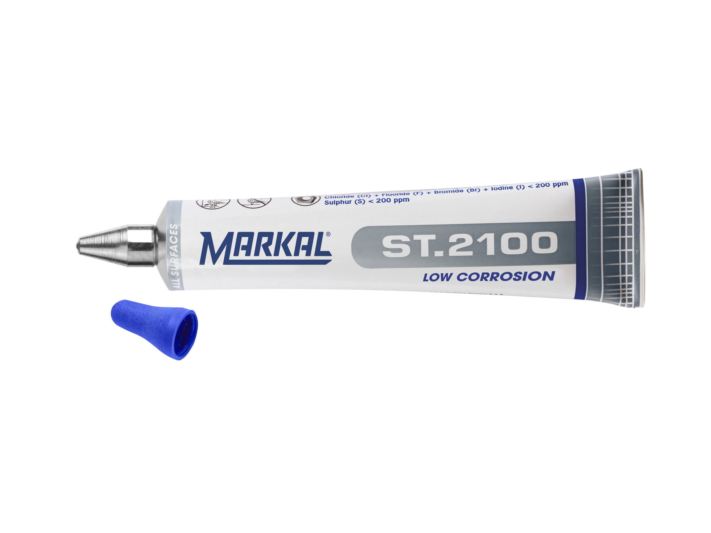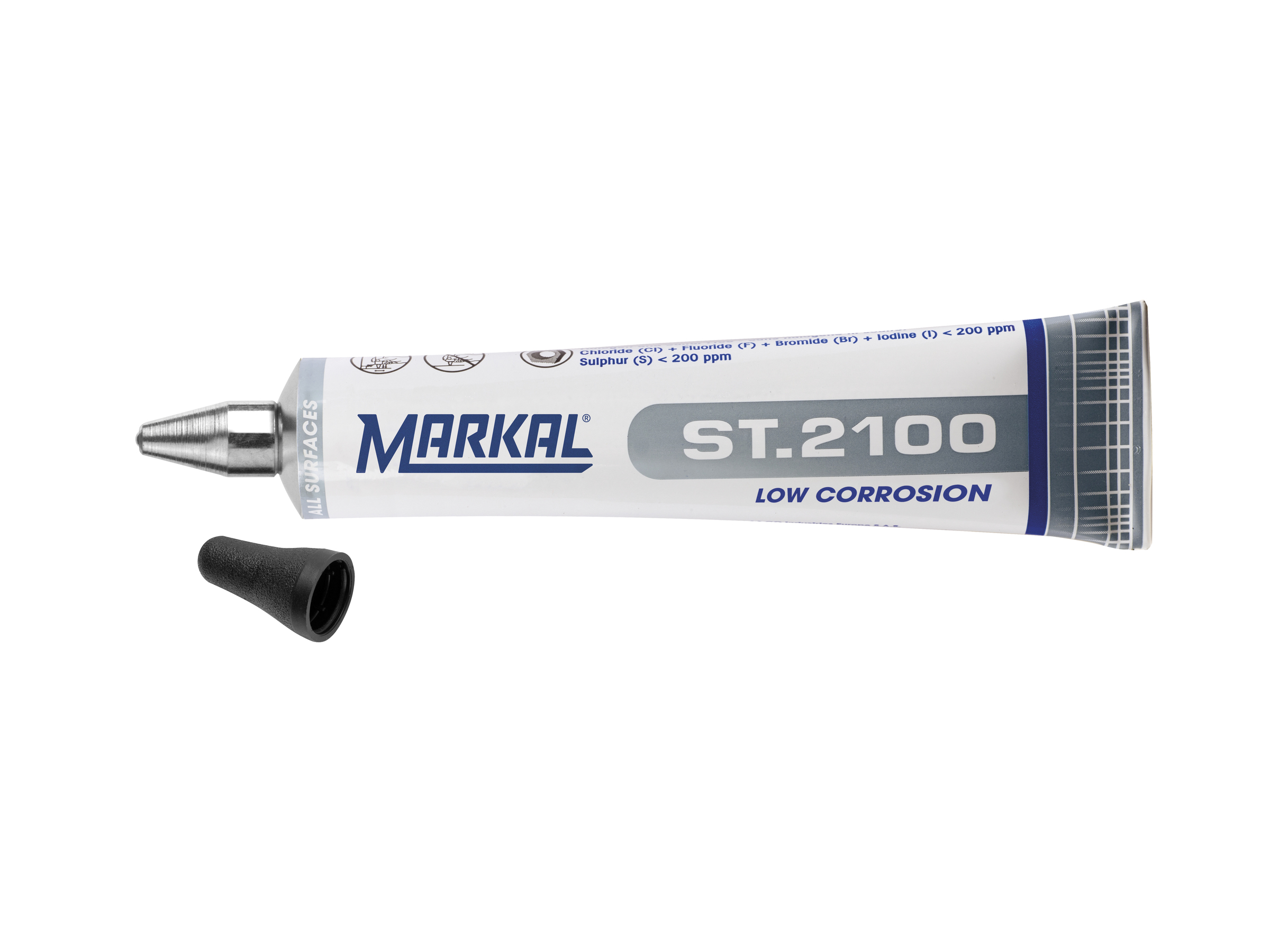 Golyós festékmarker rozsdamentes acélokhoz – egy nagy teljesítményű, tanúsított megoldás, amely fémgolyós hegyének és sűrű festékének köszönhetően függőleges, ferde vagy fej fölötti felületeken is stabil jelölést tesz lehetővé. A marker alacsony kén- és klórtartalmú formulája minimalizálja a korrózió kockázatát érzékeny fémeken.