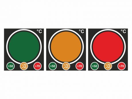 Ezek az öntapadós egyszínű címkék hőmérsékletre érzékeny elemek sorozatából állnak, amelyek mikroenkapszulált termokróm folyadékkristályokat tartalmaznak. Az egyszínű címkék színváltozásai visszafordíthatók, ami azt jelenti, hogy a megjelenő és fenntartott szín feketévé válik, ahogy a hőmérséklet visszafordul.”